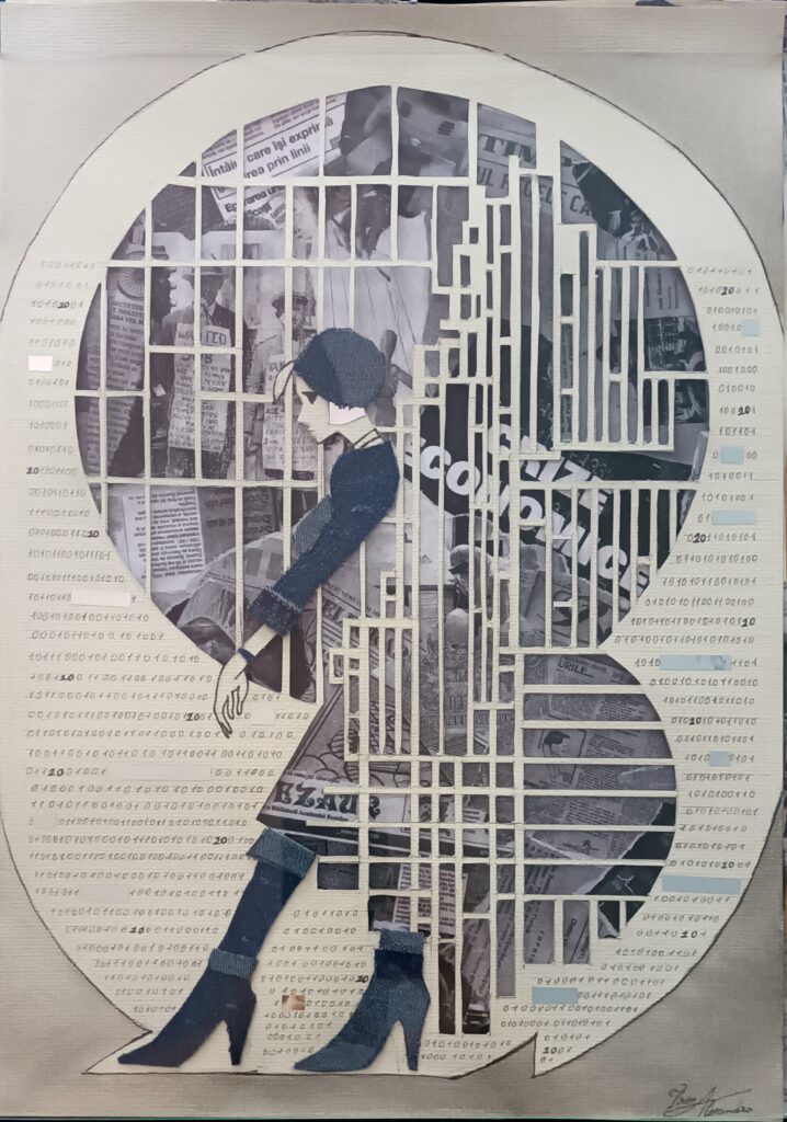 Alexandra Tiron (b. 2005) is a visual artist from Iași, Romania. She graduated from the “Octav Băncilă” National College of Arts and is currently studying at the “George Enescu” University of Arts, Faculty of Visual Arts and Design (Interior Design), as well as at the “G. M. Cantacuzino” Faculty of Architecture. She has participated in the National Architecture Olympiad, international workshops such as DIVERS-CULT (Promoting Cultural Diversity in Schools), Junior Achievement programs, and student exhibitions. Her artistic practice focuses on collage and mixed media, exploring the intersection between tradition and contemporaneity, as well as how mass media and community shape identity and the perception of time.